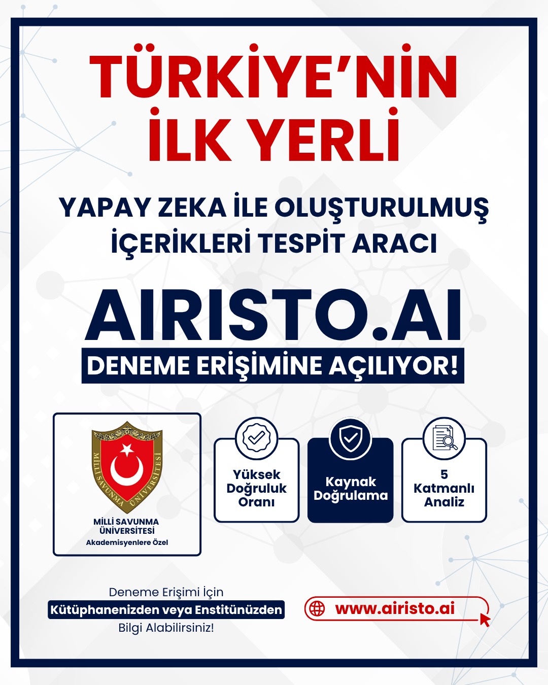 Türkiye'nin ilk yerli yapay zeka ile oluşturulmuş içerikleri tespit aracı AIRISTO.AI 01.12.2025 tarihine kadar deneme erişimine açılmıştır.