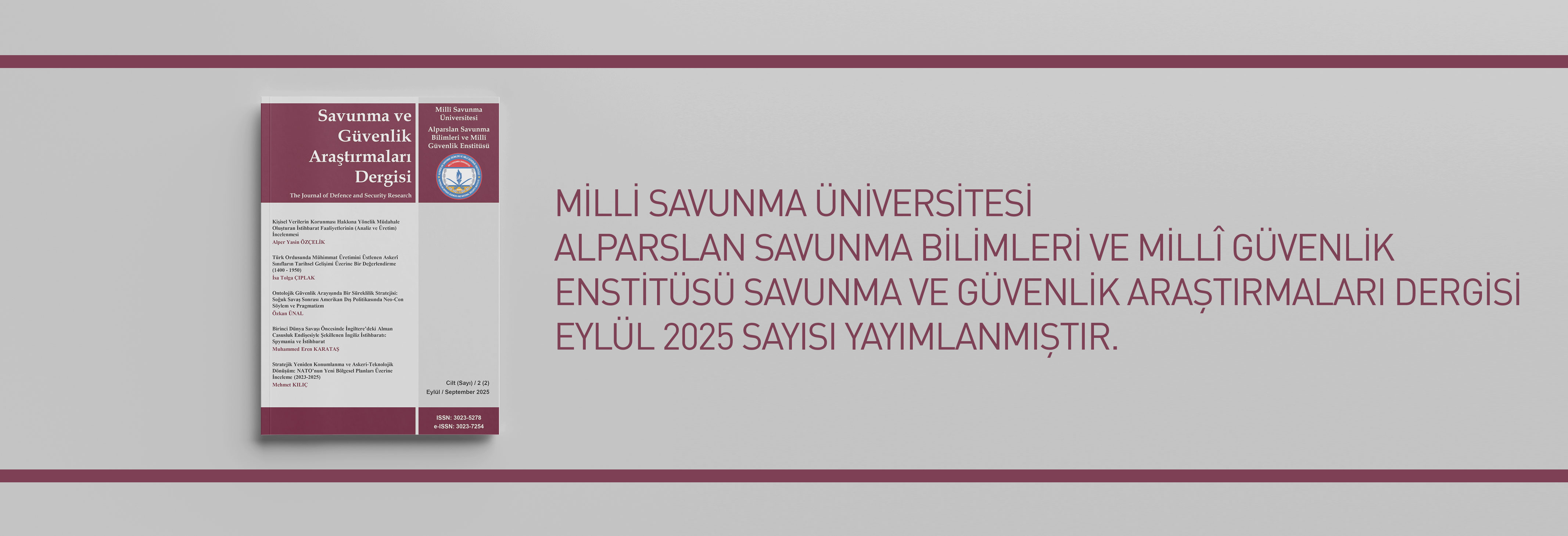 Milli Savunma Üniversitesi Alparslan Savunma Bilimleri ve Milli Güvenlik Enstitüsü Müdürlüğü Bünyesinde Yayımlanan Savunma ve Güvenlik Araştırmaları Dergisinin Eylül 2025 Sayısı Yayımlanmıştır
